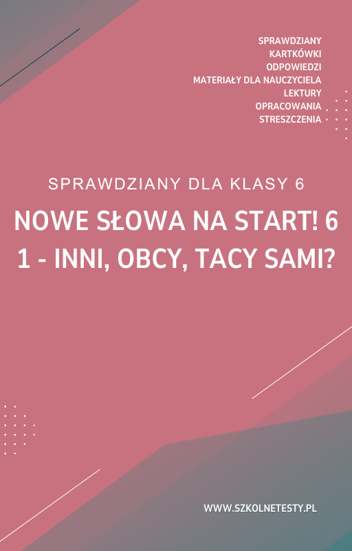 1. Inni, obcy, tacy sami? SPRAWDZIAN ODPOWIEDZI NOWE Słowa na start! 6 to świetna pomoc dla uczniów, którzy przygotowują się do testu. Zawiera pełne odpowiedzi, co umożliwia samodzielne sprawdzenie wyników i lepsze zrozumienie materiału. Idealne narzędzie zarówno do nauki, jak i powtórek przed egzaminami, wspierające uczniów, nauczycieli oraz rodziców.