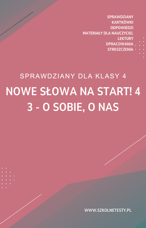 3. O sobie, o nas SPRAWDZIAN ODPOWIEDZI NOWE Słowa na start! 4 to świetna pomoc dla uczniów, którzy przygotowują się do testu. Zawiera pełne odpowiedzi, co umożliwia samodzielne sprawdzenie wyników i lepsze zrozumienie materiału. Idealne narzędzie zarówno do nauki, jak i powtórek przed egzaminami, wspierające uczniów, nauczycieli oraz rodziców.