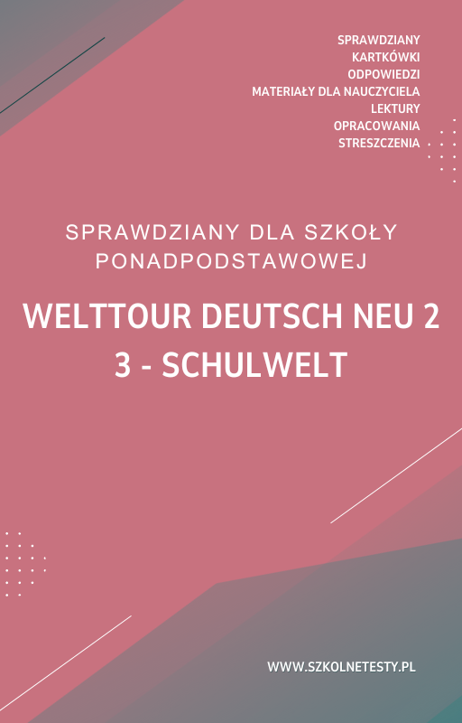 3. Schulwelt SPRAWDZIAN ODPOWIEDZI Welttour Deutsch neu 2 to skuteczna pomoc dla uczniów, którzy przygotowują się do sprawdzianu. Zestaw zawiera pełne odpowiedzi do każdego zadania, umożliwiając samodzielne sprawdzenie wyników i dokładniejsze zrozumienie materiału. Dzięki temu uczniowie mogą szybciej opanować zagadnienia, a nauczyciele i rodzice zyskają pomoc w monitorowaniu postępów.