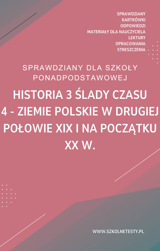 4. Ziemie polskie w drugiej połowie XIX i na początku XX w. SPRAWDZIAN ODPOWIEDZI Historia 3 Ślady czasu to świetna pomoc dla uczniów, którzy przygotowują się do testu. Zawiera pełne odpowiedzi, co umożliwia samodzielne sprawdzenie wyników i lepsze zrozumienie materiału. Idealne narzędzie zarówno do nauki, jak i powtórek przed egzaminami, wspierające uczniów, nauczycieli oraz rodziców.