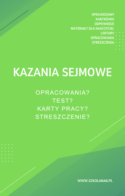 Kazania sejmowe Sprawdziany, Opracowanie, Notatki – Pobierz teraz! PDF do książki Kazania sejmowe Sprawdziany, Opracowanie, Notatki z pełnymi odpowiedziami! Idealne wsparcie dla nauczycieli i uczniów, którzy przygotowują się do egzaminów. Pobierz gotowe materiały i popraw efektywność nauczania!