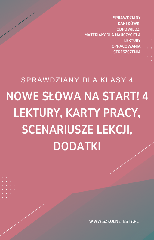 NOWE Słowa na start! 4 LEKTURY – KARTY PRACY – SCENARIUSZ LEKCJI – DODATKI to świetna pomoc dla uczniów, którzy przygotowują się do testu. Zawiera pełne odpowiedzi, co umożliwia samodzielne sprawdzenie wyników i lepsze zrozumienie materiału. Idealne narzędzie zarówno do nauki, jak i powtórek przed egzaminami, wspierające uczniów, nauczycieli oraz rodziców.