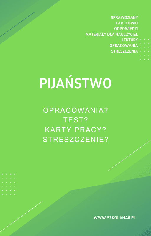 Pijaństwo Sprawdziany, Opracowanie, Notatki – Pobierz teraz! PDF do książki Pijaństwo Sprawdziany, Opracowanie, Notatki z pełnymi odpowiedziami! Idealne wsparcie dla nauczycieli i uczniów, którzy przygotowują się do egzaminów. Pobierz gotowe materiały i popraw efektywność nauczania!