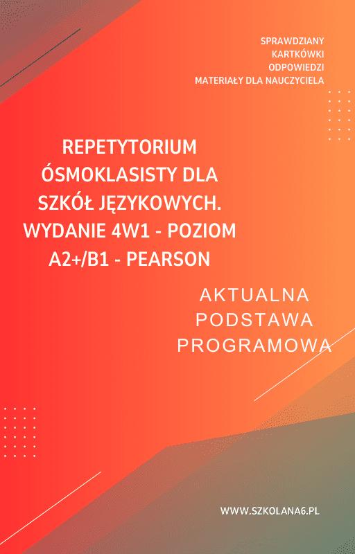Repetytorium ósmoklasisty dla szkół językowych. Wydanie 4w1 – POZIOM A2+/B1 – PEARSON Sprawdziany – Pobierz teraz! PDF do książki Repetytorium ósmoklasisty dla szkół językowych. Wydanie 4w1 – POZIOM A2+/B1 – PEARSON Sprawdziany z pełnymi odpowiedziami! Idealne wsparcie dla nauczycieli i uczniów, którzy przygotowują się do egzaminów. Pobierz gotowe materiały i popraw efektywność nauczania!